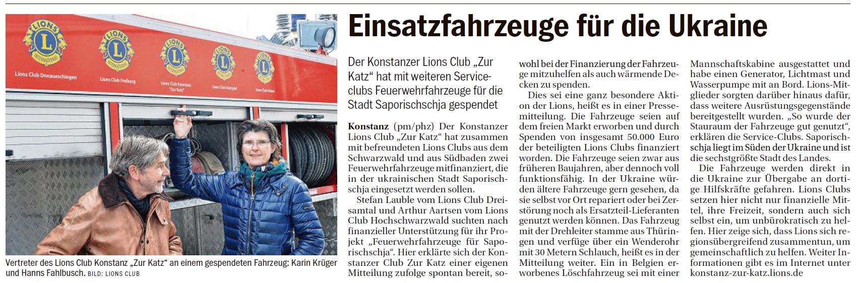 Der Konstanzer Lions-Club „Zur Katz“ hat zusammen mit befreundeten Lions-Clubs aus dem Schwarzwald und aus Südbaden zwei Feuerwehrfahrzeuge mitfinanziert, die in der ukrainischen Stadt Saporischschja eingesetzt werden sollen.